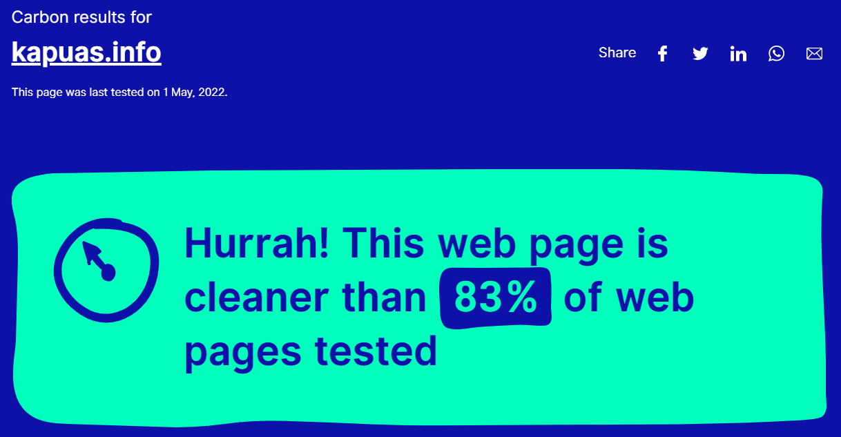 Saat membaca Exponential View edisi Ahad, 1 Mei 2022, saya melihat alamat situs yang dapat menilai pemanfaatan karbon dari sebuah "web page". Saya mencoba untuk menilai Informasi Kapuas (kapuas.info). Ternyata nilainya cukup bagus. Mudah-mudahan ini merupakan salah satu kontribusi untuk mengurangi karbon.